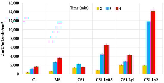 Additionally, the potential indirect mutagenic effect was evaluated through metabolic products, where all the samples analyzed with the microsomal enzyme activator (+S9) showed a lack of genotoxicity due to the values of the induction factor (IF) being lower than 1.5 (Table 1). A significant decrease in genotoxicity was observed especially in combination with CS–Ly with microsomal activation (+S9) compared with the same non-activated combinations (-S9). In the presence of microsomal enzymes, mixtures of CS–Ly were ten times less genotoxic. Consequently, indirect mutagenesis was non-existent, and this will allow safe applications without systemic effects.