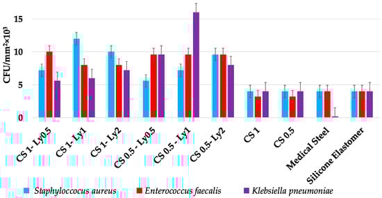 Sample parts of 5–6 mm were washed in 70% alcohol at 37 °C for 30 min. The tested strains were Staphyloccocus aureus ATCC 23235 (Gram-positive), Enterococcus faecalis ATCC 29212 (Gram-positive) and Klebsiella pneumoniae ATCC 13883 (Gram-negative). Bacterial suspensions of 1 × 107 CFU/mL with Mueller–Hinton Broth, according to the 0.5 McFarland standard, measured with a densitometer (Biomerieux, Marcy-l’Étoile, France), were prepared. The dilution was made with physiological serum. The membranes were placed in the sterile cell culture plates (24 wells). Bacterial suspensions (1 mL, 10 % Mueller–Hinton Broth) were added and incubated for 24 h in static conditions at 37 °C in a My Temp mini Z763322 digital incubator (Benchmark Scientific Inc., Sayreville, NJ, USA). After incubation, the membranes were washed with distilled water 3 times to remove the suspended bacteria, which did not attach to the biofilm. For control, standardized 0.5 mm type samples, such as silicone elastomer, medical steel and chitosan membranes without the plant extract, were used. At the end, the samples (pieces of membranes) were placed on 1 mL buffer solution (PBS) and inserted for 5 min in sterile Eppendorf tubes in a MiniLabRoller Agitator to dislodge the bacteria adhering to the substrate. Then, a series of 5 dilutions were made (1:2, 1:4, 1:8, 1:16, 1:100), and from each microvolume (5 µL) was placed on the TSA culture medium, in spots.