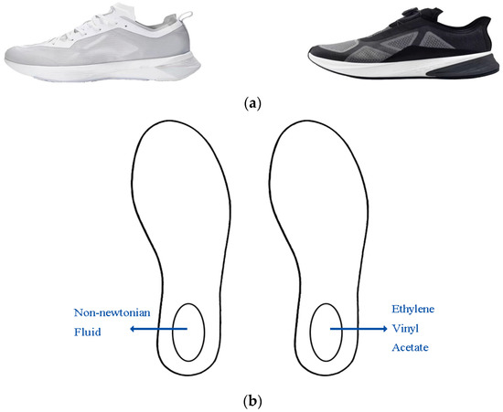 Experimental shoes were used by the participants. (a) The non-Newtonian fluid (NN) shoe is on the left-hand side and the ethylene vinyl acetate (EVA) shoe is on the right-hand side; (b) location of the cushion materials within the midsole.