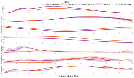 Comparison between EVA’s GRF and sagittal plane joint angles for hip, knee, and ankle joints and muscle activity.