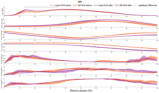 Wearing NN increased the torque in the sagittal plane of the knee by 21–23% (p = 0.001) and 37–45% (p < 0.001) of the stance phase after running for 5 km, as shown in Table 2. There was no significant effect on the peak sagittal torque of the hip and ankle joints.