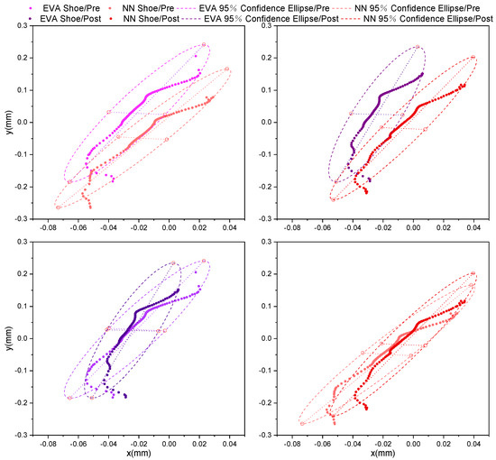 Depiction of the COP trajectory, as well as the results of the x-axis offset range, y-axis offset range, and envelope area. The upper left and upper right boxes represent the COP variations for different midsole materials at the same temperature. The bottom left and bottom right are the COP variations for the same shoe tool at different temperatures.