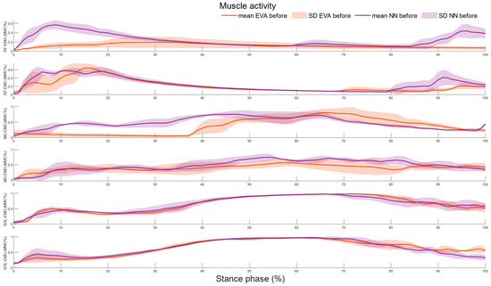 The raw EMG signals were filtered in the frequency range of 10–500 Hz using a bandpass fourth-order Butterworth filter [37]. The filtered EMG amplitudes were smoothed with a root mean square (RMS) with a window size of 50 ms. Next, the EMG signal was normalized to the peak MVIC amplitude, and the dataset was then time normalized (0–100%) to the stance phase of the running trials.