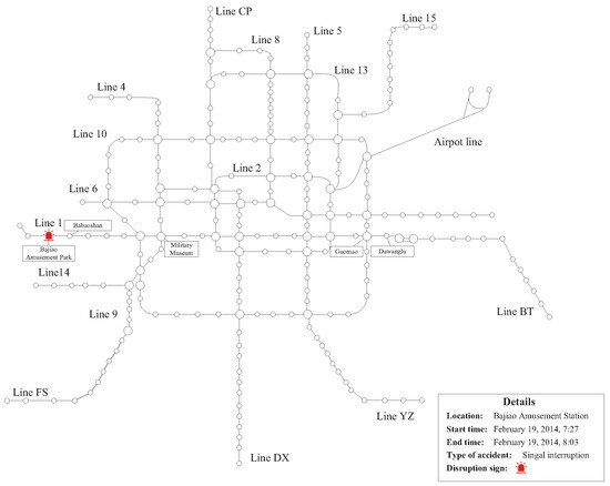 Line 1 is the main rail transit line in the Beijing rail transit system. It crosses the whole central urban area and undertakes important passenger transportation tasks in the morning and evening rush hour. Moreover, line 1 closely links residents living in the east and west areas of Beijing. On 19 February, a signal interruption occurred at Bajiao Amusement Park station on line 1 between 7:27 a.m. and 8:03 a.m. It affected the operation of adjacent stations and the regional networks, which caused 30 trains to be stopped and 5 trains to be turned back halfway. The Beijing rail transit network and the location of the disruption are illustrated in Figure 2. No signal interruption occurred on the other days.