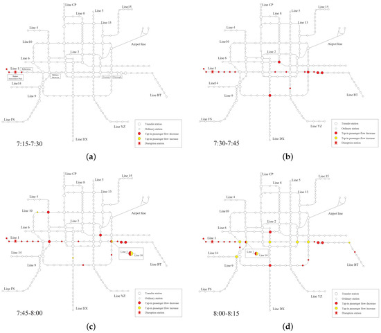 (b) By analyzing the spatiotemporal distribution of abnormal stations in the network after the disruption, it was found that the first stations to be affected were those adjacent to the disrupted station. The tap-in passenger flow at these stations decreased significantly at the beginning of the disruption. Generally, the disruption did not affect ordinary stations on other lines. Moreover, all stations affected by the disruption could be sorted by their recovery speed, from fastest to slowest, as follows: ordinary stations that were far away from the disrupted station, adjacent stations, and transfer stations. The duration for which transfer stations were affected by the disruption was the longest. Furthermore, in contrast to transfer stations, ordinary stations affected by the disruption did not suffer an increased tap-in passenger flow after the disruption.