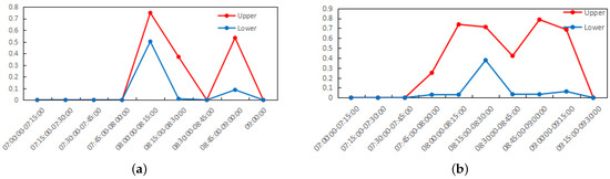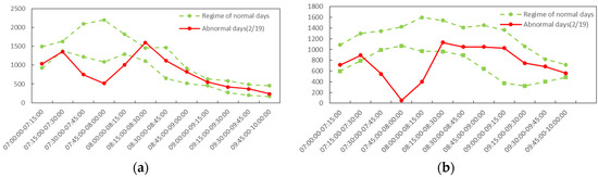 Babaoshan station (close to the disrupted station) and Dawanglu station (far away from the disrupted station) are two ordinary stations on line 1 that were selected as representatives to analyze the calculation results of the fluctuation range of the tap-in passenger flow. The fluctuation curve of the tap-in passenger flow from 7:00 a.m. to 10:00 a.m. at Babaoshan station and Dawanglu station are shown in Figure 4a and Figure 4b, respectively.