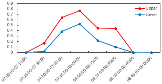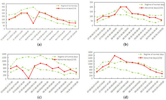 After determining the stations affected by the disruption, the law of propagation during the disruption needs to be further analyzed. Therefore, it is necessary to calculate the intensity of the impact on the tap-in passenger flow at abnormal stations due to the disruption (the influence intensity for short) during different time periods. Because the passenger flow data of each station are collected and uploaded every 15 min by the AFC system, many studies have used a period of 15 min to count or predict passenger flow in urban rail transit systems [6,21,34,35,36]. In this study, the tap-in passenger flow for a period of 15 min at each station was counted.