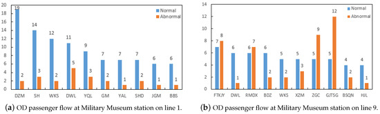 Similarly, the OD passenger flow at Military Museum station is shown in Figure 10. As a transfer station close to the disrupted station, the passenger flow at Military Museum station on line 1 significantly decreased after the disruption, and most of the passengers who exited the flow were short-distance travelers. On the contrary, the passenger flow at Military Museum station on line 9 increased because passengers chose to transfer to line 9 after the disruption. In general, the disruption had a great influence on the passengers traveling long distances at the transfer station. Due to the functions of the transfer station, the impact of the disruption propagated to the transfer line, which significantly increased the passenger flow on the transfer line.