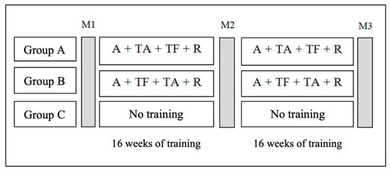 Both experimental groups (Group A and Group B) performed the same multicomponent training exercises. The only difference between the two groups was the order in which aerobic and resistance exercises were conducted. Group A followed the following sequence: warm up, aerobic training, resistance training, and cool-down phase. On the other hand, Group B performed the warm up, followed by resistance training, aerobic training, and cool-down phase. The control group (CG) did not participate in any exercise intervention throughout the study period. Figure 2 illustrates the study’s outline and provides a visual representation of the experimental design and the groups involved in the investigation. The participants were evaluated three times during the 32-week intervention period. The first assessment (M1) took place at the initiation of the training program. The second assessment (M2) was conducted after 16 weeks of training, serving as an intermediate evaluation. The final assessment (M3) was performed after the completion of 32 weeks of training. It is important to note that all groups underwent the same evaluation procedures at each assessment point, ensuring the consistency and comparability of measurements.