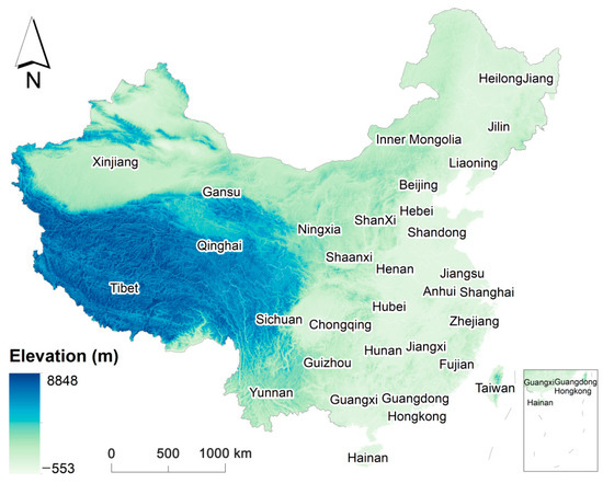 China has a complex topography (Figure 1) and a wide variety of ecosystems [23], encompassing subtropical, tropical, temperate, boreal, and highland regions. Among these, forest and grassland ecosystems dominate in terms of extent. Forest ecosystems span across Northeast, North, South, Southwest, and Northwest China, covering approximately 22.96% of the country’s total area. Meanwhile, grassland ecosystems thrive in the Qinghai-Tibet Plateau, Inner Mongolia, Xinjiang, and Northwest China, accounting for 41.94% of the nation’s land area [24].