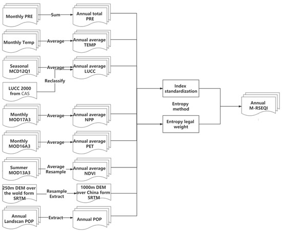The data processing process mainly includes annual synthesis of indicator data, resampling, indicator standardization (selection of uniform extreme values), and weighted summation of indicators (Figure 2). The details are shown below: