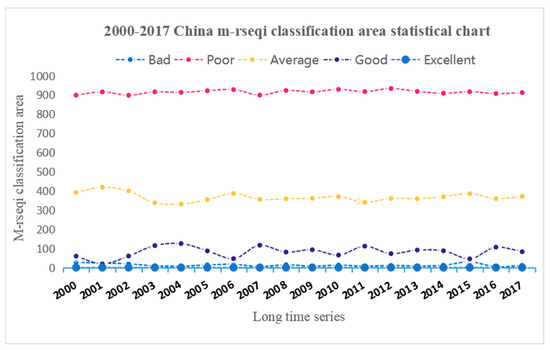 In order to gain insight into the degree of superiority and inferiority of China’s EEQ from 2000–2017, this paper classified China’s M-RSEQI from 2000–2017 based on Table 3, and the results are shown in Figure 3 and Figure 4.