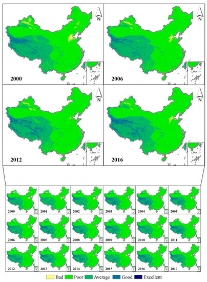 Spatial distribution pattern of M-RSEQI in China from 2000 to 2017.