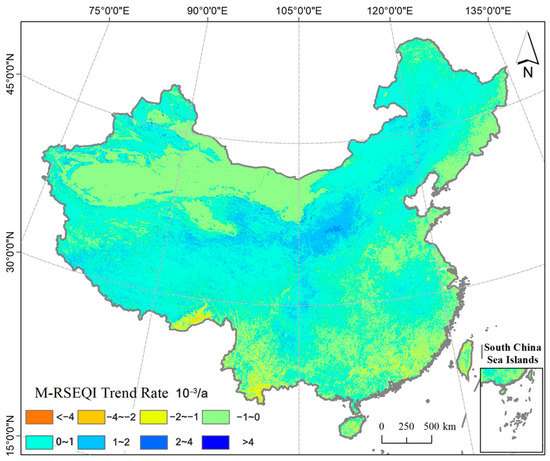 Among the 35 provinces in China, including municipalities directly under the Central Government and Taiwan Province, 17 provinces displayed an increasing trend in the M-RSEQI, while 18 provinces exhibited a decreasing trend. Notably, the Ningxia Hui Autonomous Region had the fastest increasing speed (slope = 0.99 × 10−3a−1), whereas the Hong Kong Special Administrative Region had the fastest decreasing speed (slope = −0.74 × 10−3a−1). At the national level, the M-RSEQI showed a gradual improvement trend, albeit at a slow pace (slope = 0.18 × 10−3a−1).