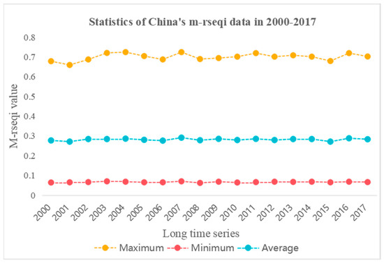 The time series analysis captures the changes in the maximum, minimum, and average values of M-RSEQI in China from 2000 to 2017.