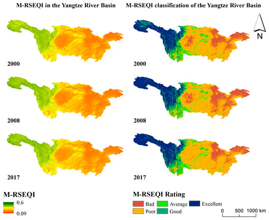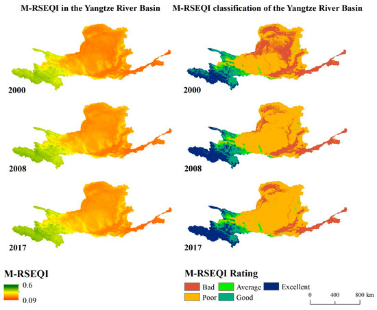 M-RSEQI distribution map and M-RSEQI classification map of the Yangtze River Basin in 2000, 2008 and 2017.