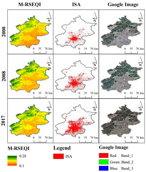 M-RSEQI, impervious area (ISA) and Google historical images of Beijing in 2000, 2008 and 2017.