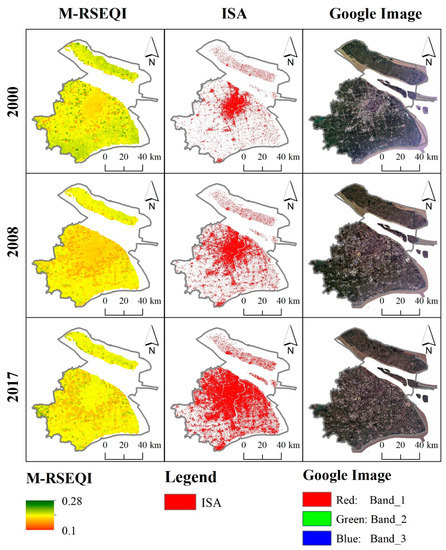 M-RSEQI, ISA and Google historical images of Shanghai in 2000, 2008 and 2017.