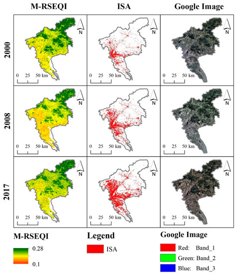 M-RSEQI, ISA, and Google historical images of Guangzhou in 2000, 2008 and 2017.