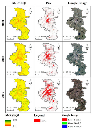 M-RSEQI, ISA and Google historical images of Nanjing in 2000, 2008, and 2017.