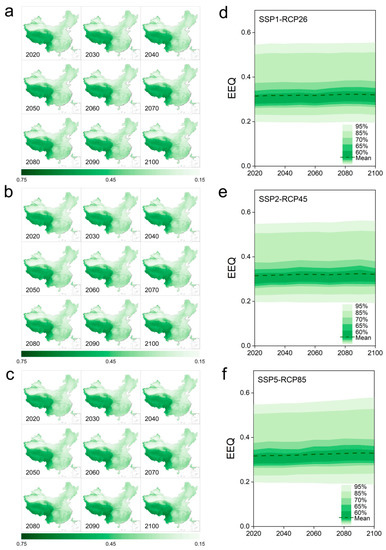 Characteristics of future (2020–2100) spatial (a–c) and temporal changes (d–f) in EEQ in China.
