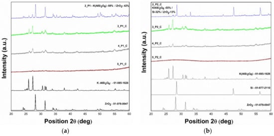 P2 showed a different behavior during the first firing, additionally highlighting the Si crystalline phase (Figure 2). After the second firing, KAlSi2O6 became a unique crystalline phase. The subsequent firing steps determined the decrease in the crystalline structure until, in the case of the fourth firing, the ordered structure of the ceramic layer was destroyed, becoming amorphous; this indicates that the Si content may affect the behavior of the ceramic.