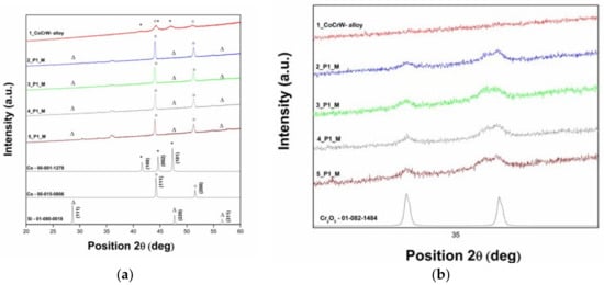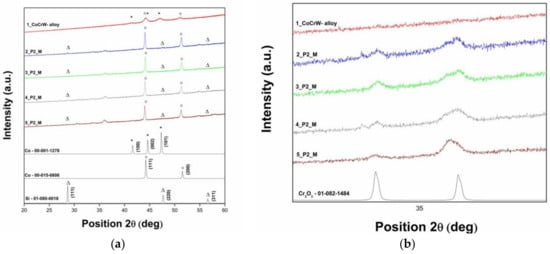 Furthermore, a new crystalline phase of Cr2O3 with rhombohedral symmetry (JCPDS no. 01-082-1484, space group: R-3c) developed during the ceramic deposition process (Figure 2b and Figure 3b). According to Table 5, P1 favored the chromium oxidation of the dental alloy at up to 5.3% of (110) relative intensity, in contrast to the 15.65% value in the case of P2. The relative intensity for the (110) crystal plane of Cr2O3 was obtained by dividing the absolute intensity of this peak by the absolute intensity of the most intense peak corresponding to the (111) crystal plane of Co, then converting it to a percentage.