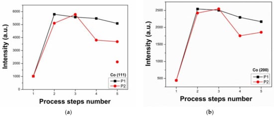 The evolution of the diffraction peak intensity in the function of the number of firings: (a) (111) crystal plane of Co; (b) (200) crystal plane of Co, and (c) (110) crystal plane of Cr2O3.