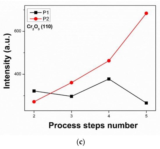 The evolution of the relative intensity for the (110) crystal plane of Cr2O3 after each firing.