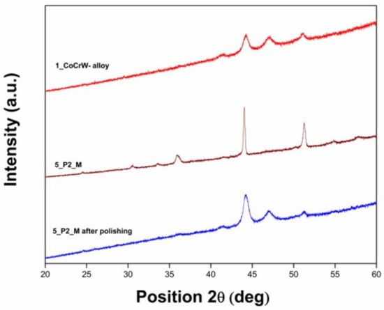 To further analyze whether chromium oxidation is a surface or bulk process, the Cr2O3 layer was removed by polishing. The XRD pattern revealed that there was no Cr2O3 phase, highlighting the fact that chromium oxidation occurs only at the surface of the alloy, with the red dot representing the intensity of the crystallographic planes after polishing (Figure 4a). The low crystalline ordered structure and the lower intensity of the planes of the polished sample, compared with the unpolished sample, highlight the fact that the structural transformation of the dental alloy is a surface process (Figure 5).