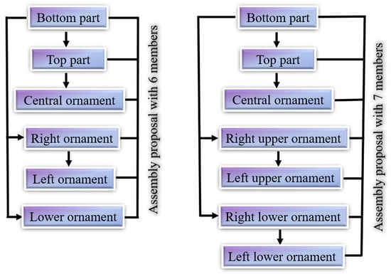 The maximum number of assembly members has been set at 7. According to the designer’s imagination, the design of the bottom part will be created, on which the total number of assembly members will depend. We have considered 2 design alternatives; their schematics are shown in Figure 5.