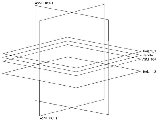 Virtual modeling starts at the level of creating a new assembly, where a file with the extension *.asm is created. The assembled model will be the basis for the design. At the highest level of modeling, the basic 3 reference datum planes (front, top, right and the corresponding axes in the X, Y and Z directions) are created based on the assembly template. The skeleton will consist of 2 datum planes (height_1 and height_2), which will be parallel to the top plane and their mutual distance will define the height of the steering wheel. The other reference plane will be a plane parallel to the top plane and offset by a distance that will define the height of the circular rotation of the steering wheel. If necessary, new reference elements can be inserted into the skeleton at any time. These are then transferred to individual models as needed.