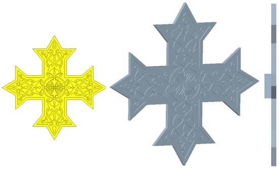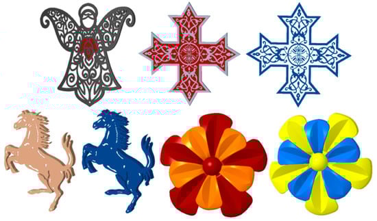- Right_upper_ornament and left_upper_ornament are monochromatic and their color adds to the complexity of the color effect. We chose the colors as follows: on the central ornament, one color is always dominant, represented in a higher proportion, and the other color is in a minor proportion. For the right and left upper ornament, we have chosen the minority color. Figure 20 shows the color variations in the upper right ornament only (the left ornament is identical in color; only the text differs), complementing the colors of the central ornaments. The models are shown with visible edges for better visibility of the text.