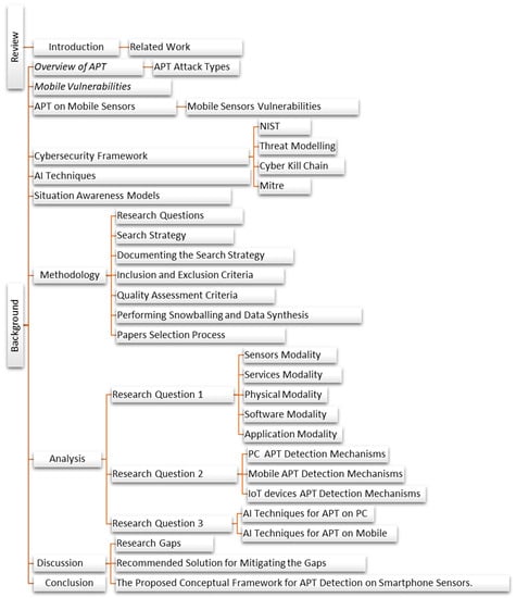 This study provides an SLR of APT detection for mobile devices and an exploration of AI techniques, such as game theory, as a potential solution. It can be used to design guidelines and policies to secure against APT attacks on mobiles and raise awareness of the challenges, effects, and consequences of APT attacks. It has identified, explored, and evaluated various detection mechanisms used to detect APTs on smartphones and proposed a conceptual framework for the situational awareness model. Finally, the review and proposed conceptual framework (FORMAP) have addressed the gaps concerning the detection of APTs in smartphone sensors, applications, and behavior. Figure 1 illustrates the outline structure of this research study.