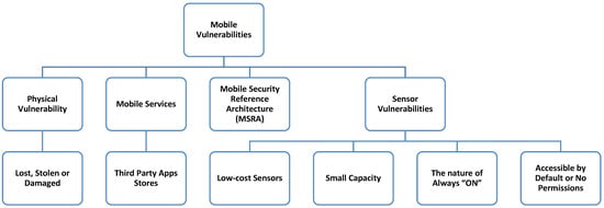 Employing mobile security reference architecture (MSRA) alone is insufficient as attacks evolve from time to time, leading to the inability to tackle the attack and difficulties in recognizing new attacks [2]. In addition, large attack surfaces are due to various mobile network protocols (Wi-Fi, GPS, short messaging services (SMSs), multimedia messaging services (MMSs)). Mobile sensors are vulnerable to unauthorized access due to default settings that allow access to sensor data without permission. The small size and low cost of these sensors, and their default “always ON” mode, increase the likelihood of potential attacks.