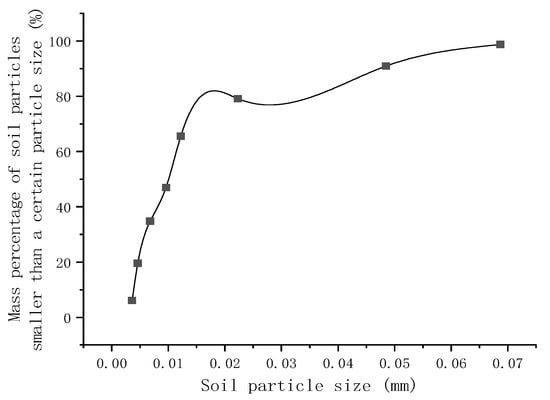 The red clay used in this study was taken from the reconstruction and expansion project of Niuchang–Daoping Highway in Fuquan City, China. The soil sampling depth was approximately 3 m. The color of the soil sample was yellow-brown, the soil quality was uniform, the soil sample was moist, the structure was relatively dense, and there was a small amount of vegetation. Rhizomes and gravel were present. The basic physical indicators are shown in Table 1, the chemical composition is shown in Table 2, and the particle size distribution curve is shown in Figure 1.