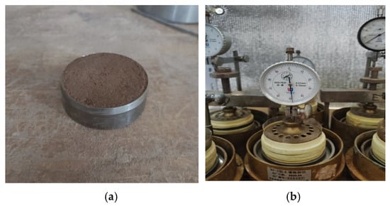The static compaction method was used to prepare ring knife samples with the ratios in Table 6, the ring knife sample and dilatometer are shown in Figure 3. The sample was put into the dilatometer to start the test, water was poured into the dilatometer and entered the sample from bottom to top, and the water surface level was kept 5 mm higher than the test sample. The start time was recorded when water was injected, and compression was applied for 5 min, 10 min, 20 min, 30 min, 1 h, 2 h, 3 h, or 24 h, and then indicator readings were taken for 24 h or until sample expansion was not more than 0.01 mm within a 2 h interval. Then, deformation was deemed stable, and the test was terminated [33].