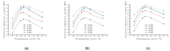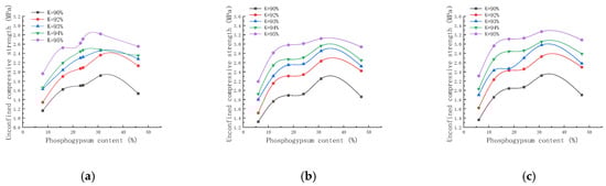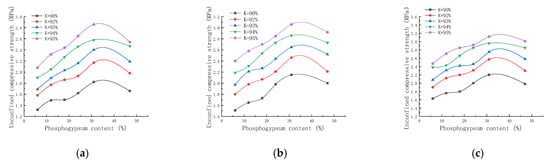 Relationship between phosphogypsum content and unconfined compressive strength with lime content L = 6%. (a) 7 d unconfined compressive strength; (b) 14 d unconfined compressive strength; (c) 28 d unconfined compressive strength.