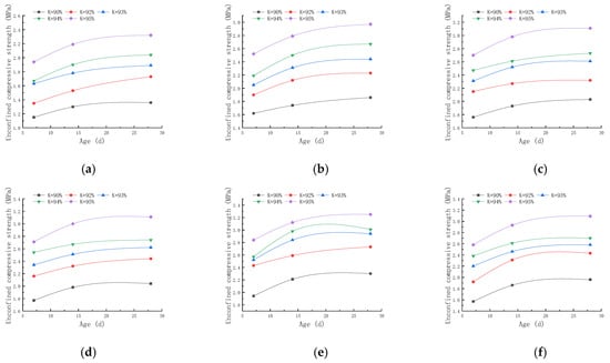 Relationship curves for unconfined compressive strength and age of the mixture (L = 8%). (a) P = 8%; (b) P = 16%; (c) P = 23%; (d) P = 24%; (e) P = 31%; (f) P = 46%.