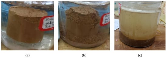 Sample preparation was the same as that used for the unconfined compressive strength tests. The samples were placed in a curing room with the temperature of 20 ± 2 °C and relative humidity of 95% or above for 6 days, and then they were immersed in water for 1 day to observe the degree of damage and carry out the unconfined compressive strength test on the complete sample [33].