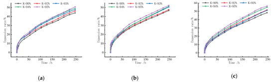 Due to space limitations, the relationship of absolute expansion rate of the mixture with time was analyzed for samples with 8% lime content, and the results are shown in Figure 10. The changes in the contents of other groups were basically the same.