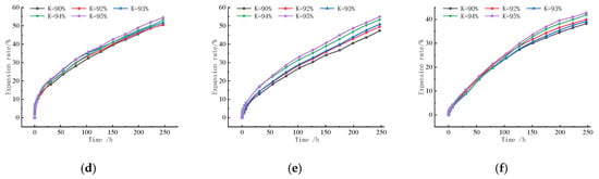 Relationship curves for absolute expansion rates of lime–phosphogypsum-stabilized soils and time (L = 8%). (a) 8%L + 8%P + 84%T; (b) 8%L + 16%P + 76%T; (c) 8%L + 23%P + 69%T; (d) 8%L + 24%P + 68%T; (e) 8%L + 31%P + 61%T; (f) 8%L + 46%P + 46%T.