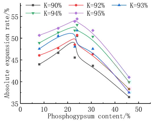 It can be clearly seen from Figure 11 that with the increase of phosphogypsum content, the absolute expansion rate of lime–phosphogypsum-stabilized red clay presents a trend of first increasing and then decreasing, and the greater the compaction degree is when the content of phosphogypsum is the same, the greater the absolute expansion rate of the mixture. For example, when the lime content is 8%, when K = 90%, the absolute expansion rate of lime:phosphogypsum = 1:2.8 reaches the maximum; when K = 95%, the absolute expansion ratio of lime:phosphogypsum = 1:3.0, the absolute expansion rate reaches a maximum. The samples with different degrees of compaction reach their maximum value between lime:phosphogypsum = 1:2.8 and 1:3. Phosphogypsum–lime-stabilized red clay’s absolute expansion rate is affected by the cementitious material and ettringite content, with the phosphogypsum content increases to generate ettringite, which destroys the mix structure, causing the mix to produce greater expansion; phosphogypsum content is too much, the mix PH value decreases, generating less ettringite, while the mix has a low content of viscous particles, the mix expansion is reduced.