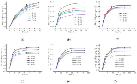 Figure 12 shows that the line for shrinkage rate first increased rapidly, then increased slowly with time and finally stabilized, and the final shrinkage rate was between 0.8% and 2.2%. For example, in (c) shrinkage of the K = 90% sample increased rapidly from 0 to 1.9% in the first 10 h and then increased slowly before reaching approximately 2.4% at 35 h, and subsequent shrinkage tended to be flat with time.
