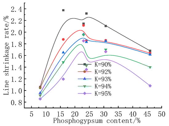 - The linear shrinkage rate of the mixture increased rapidly with time, then increased slowly and finally stabilized. With increasing phosphogypsum content, it first increased and then decreased. The line shrinkage rate was between 0.8 and 2.2%.