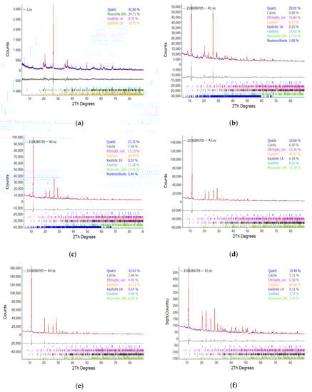 From the perspective of water stability, because muscovite, kaolinite, and montmorillonite are hydrophilic, the composition analysis in Table 8 shows that with increases in phosphogypsum, muscovite, kaolinite, and montmorillonite levels, the total amount of stone gradually decreased, the hydrophilicity gradually lessened, and the water stability increased. This also confirms the phenomenon reflected in Figure 8.