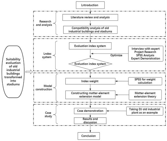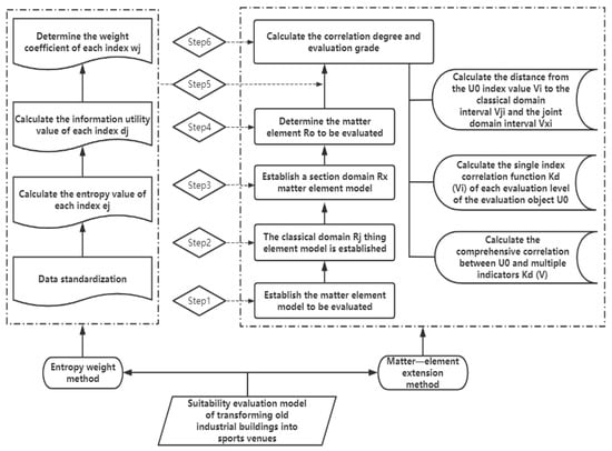 The matter–element extension method [42] is a system engineering and decision analysis method used to evaluate and optimize the performance of complex systems. Its core idea is to establish a mathematical model and evaluation system by decomposing the elements of the system into materials and expanding them. It has been extensively used in different fields. However, only a few studies exist in the field of suitability research on the transformation of old industrial buildings into stadiums and gymnasiums. In this study, the AHP was used to construct a suitability evaluation index system for the transformation of old industrial buildings into stadiums, and the entropy weight method was used to determine the weight of each index. Based on the entropy weight and matter–element extension methods, a suitability evaluation model was constructed and applied to the transformation of old industrial buildings into stadiums, and the suitability of the transformation project was analyzed as a whole. The specific process for implementing the model is shown in Figure 3.
