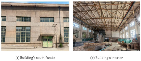 The old DJ (Refers to a specific plant) industrial plant renovation project is located in the annex of the Qinglong Temple subway station in Yanta District, Xi’an City, Shaanxi Province, China. The geographical location was superior, and the building conditions were good. The plant was a single-story, single-span, bent structure with a length of 55 m, width of 20 m, and height of 9.5 m. The construction area was approximately 1100 m2. Owing to the relocation of enterprises, the plant was idle. The current situation of the project (recycling existing plant resources and their transformation into sports venues) is represented in Figure 4.