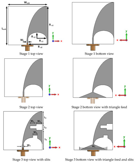 An antenna element capable of emitting pulses across a wide spectrum within the UWB frequency band is crucial for breast microwave imaging systems [18]. Figure 1 provides an overview of the four stages involved in developing the proposed antenna configuration. The initial stage (stage 1) focuses on constructing the antipodal Vivaldi antenna element to achieve the required operational bandwidth, employing traditional antenna construction techniques [19]. The antenna’s construction is depicted in Figure 1. For the antenna substrate, FR4 material with a dielectric constant of 4.65 and a height of 1.6 mm is utilized.