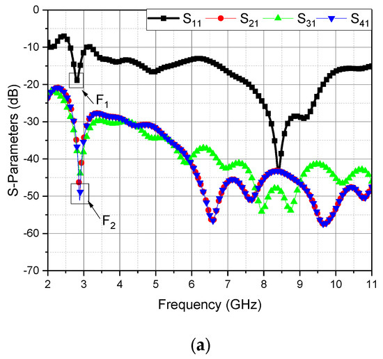 The frequencies F1 and F2 of the first minimum are determined and compared using the detection parameter ℵ = F1/F2. If ℵ < 1, it indicates the absence of a tumor, as depicted in Figure 10a, where F1 = 2.81 GHz, F2 = 2.88 GHz, and ℵ < 1. If ℵ ≥ 1, the presence of a tumor is confirmed, and the localization stage follows.